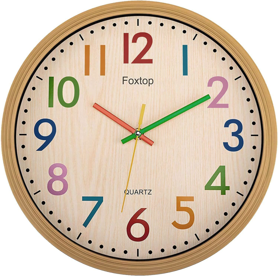 oxtop vaikiskas sieninis laikrodis, mokomasis laikrodis be tiksinciu garsu, 12 coliu analoginis vaikiskas laikrodis, skirtas laiko mokymuisi, lengvas skaitymas, vaiku kambario laikrodis, spalvingas dizainas